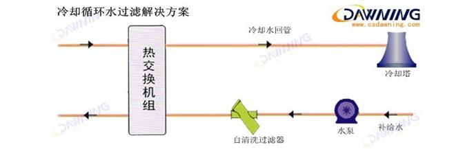 我們?yōu)槠涮峁┑倪^濾解決方案解決這一問題,如上面流程圖所示,我們在水泵和換熱器之間設(shè)備一臺自清洗過濾器(電動刷式過濾器或電動式自動排污過濾器),根據(jù)現(xiàn)場實際情況,選擇相應(yīng)的過濾網(wǎng)和過濾精度,這些將保證在不影響水系統(tǒng)正常運行的狀況下,自清洗過濾器會過濾掉符合精度的所有雜質(zhì),并在設(shè)定的壓差或時間范圍內(nèi)自動清洗濾網(wǎng)、自動排污。自清洗過濾器的設(shè)置,將大大提高系統(tǒng)的換熱效率、減少系統(tǒng)補水量、提高水的濃縮比,達到節(jié)水、節(jié)能、環(huán)保的目的。