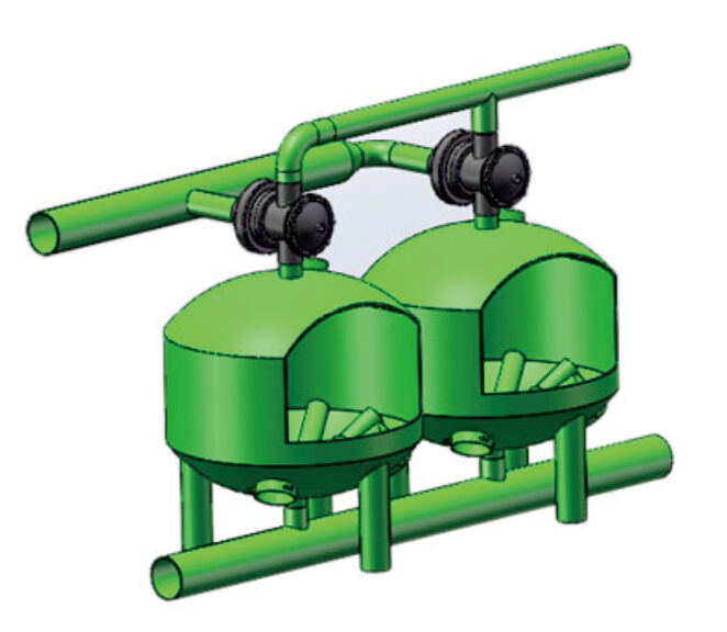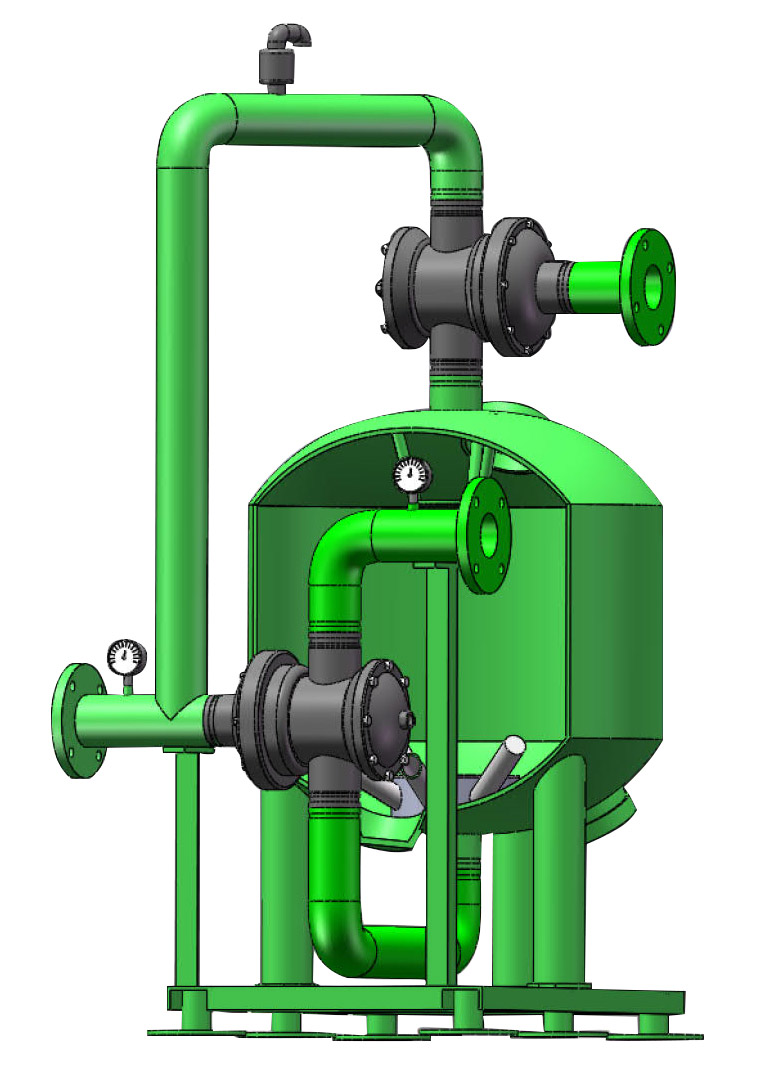 當(dāng)系統(tǒng)處于過濾狀態(tài)時,加壓水從濾罐進口流入布水系統(tǒng),均勻的到達濾料層。當(dāng)水流過濾料層時,懸浮物被濾料截留。過濾器底部有帶縫隙的集水器,過濾后的干凈水被均勻收集,并流出過濾器。